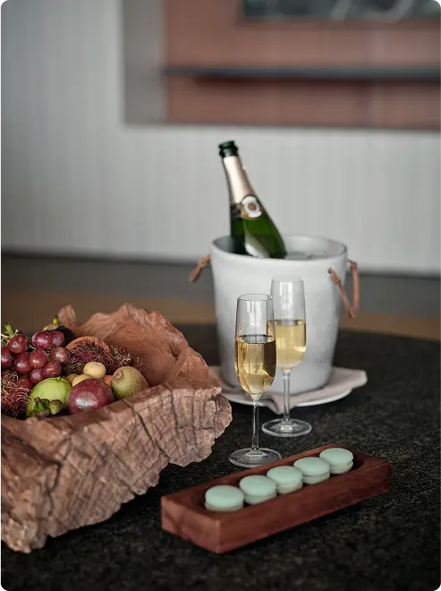 This luxurious experience starts after a 45-minute boat ride. The resort manager and private butlers will greet you and escort you to your villa or suite. The generous-sized villas have enough space for a couple or young family. Finished with rattan accents and plush sheets, it is hard not to feel relaxed in the space.