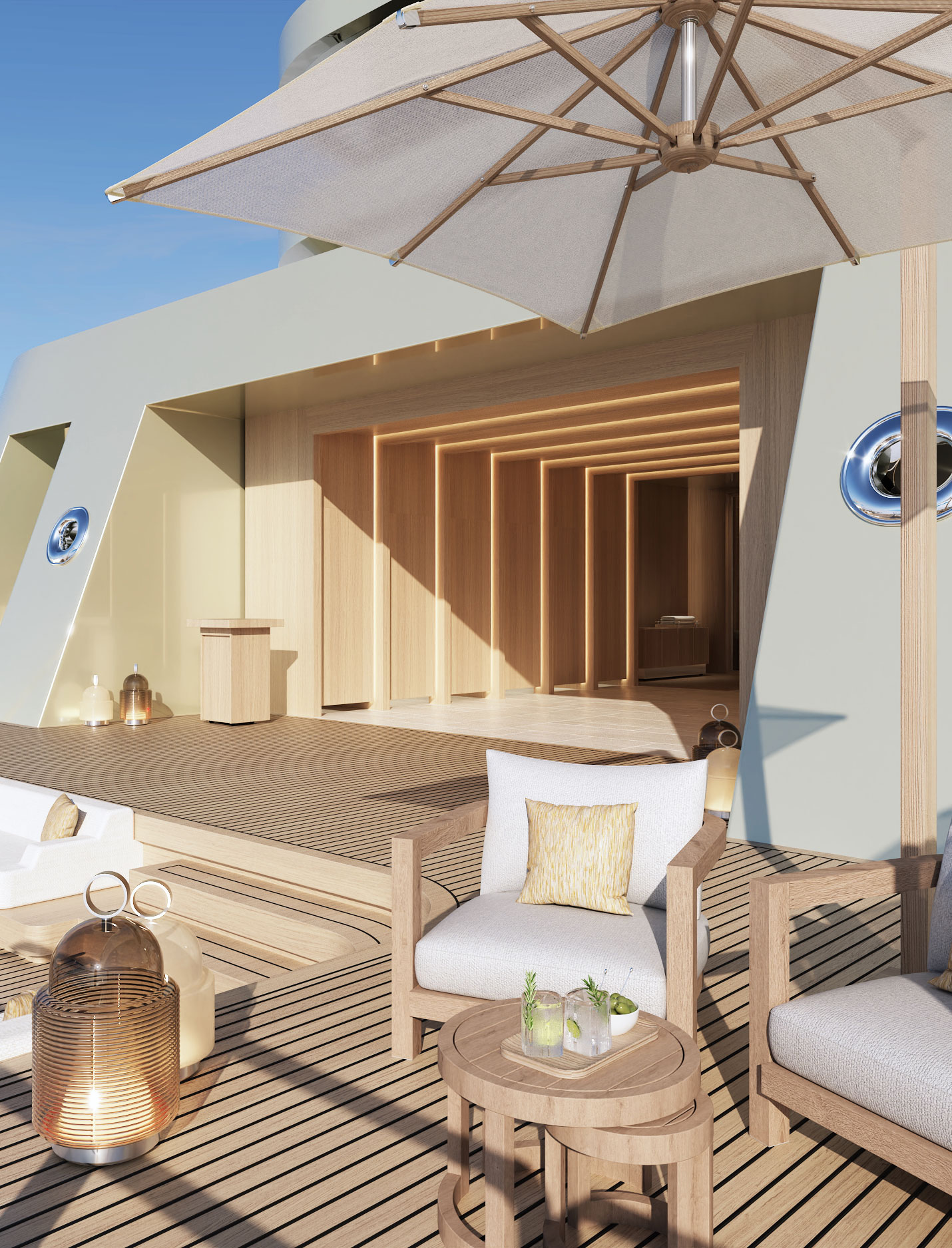 Located at the aft on Deck 6, the 16-metre pool is framed by sun loungers and daybeds, offering ample space for up to 36 guests. A quiet, open deck made for rest, boasting uninterrupted sea views.