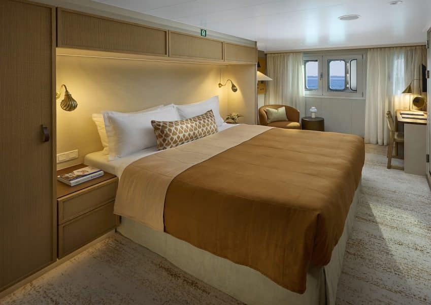 Our modern take reflects finishes that are textural—a gentle palette of rattan, linen and copper adds finishing touches that are warm and welcoming aboard this expedition vessel. Your relaxing haven after days of accessing remote destinations.