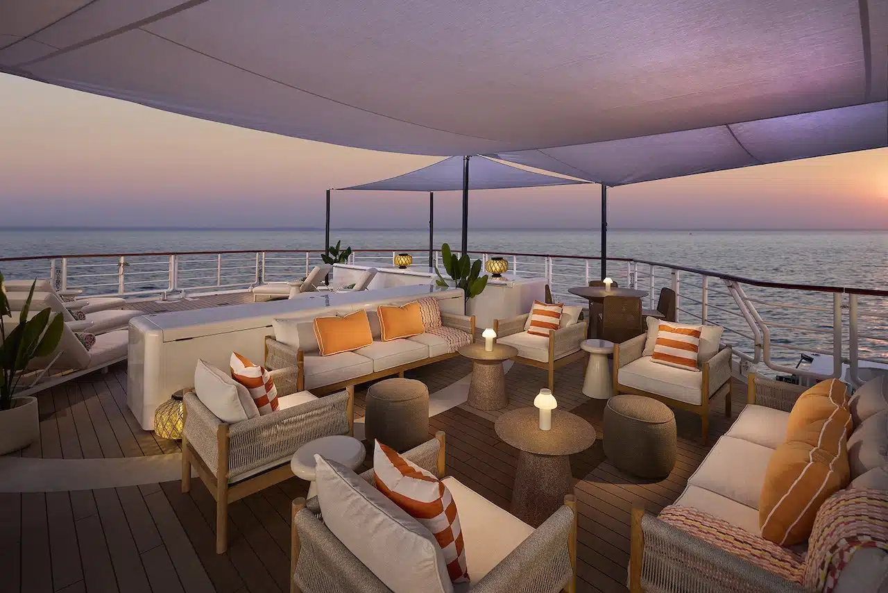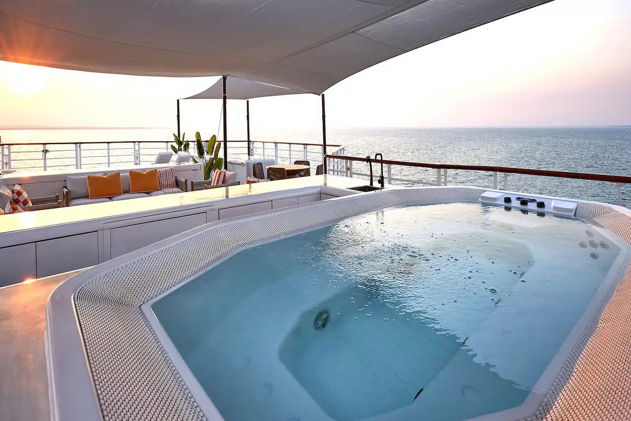 During daylight hours, the Horizon’s 32-seat outdoor restaurant becomes your social hub aboard this expedition vessel, where breakfast discussions spark anticipation for upcoming adventures. Additionally, lunch gatherings celebrate morning discoveries while accessing remote destinations. As evening approaches, ascend to the Sun Deck’s loungers and 8–10-person jacuzzi, where tensions dissolve while sharing experiences against spectacular sunset backdrops.