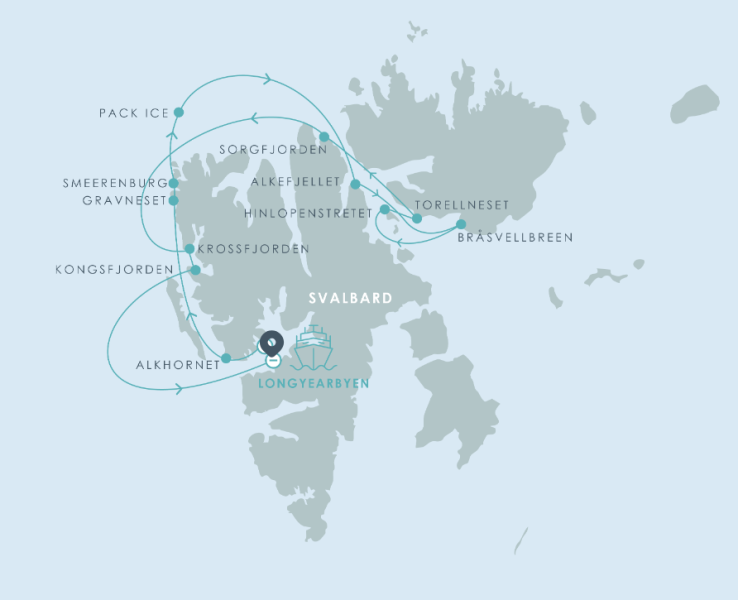 In the morning, navigate Hinlopenstretet, the strait separating Spitsbergen from Nordaustlandet. The passage is bordered by steep cliffs and several tidewater glaciers, an important summer habitat for Brünnich’s guillemots, which nest on the cliffs, and the waters may hold bearded seals and drifting pack ice. Polar bears are often sighted in this region, particularly along the ice edge. In the afternoon you will land at Torellneset, this gravel spit is a well-known walrus haul-out site, where groups of Atlantic walrus rest on the beach between feeding bouts in the surrounding shallow waters.